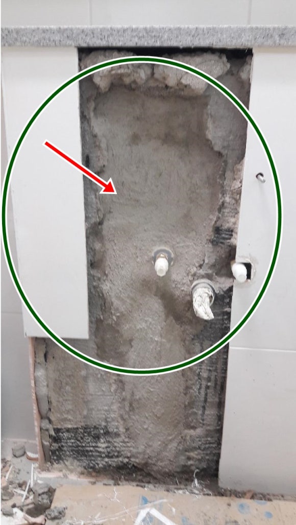 누수로 인한 젠다이 세면대 뒷부분에 물이 새고 밑층 지붕에 물이 고이는등 문제가 생겨 세면대 철거후 금이 가고 파손된 타일을 철거후 젠다이 의 재시공이 이루어졌습니다.