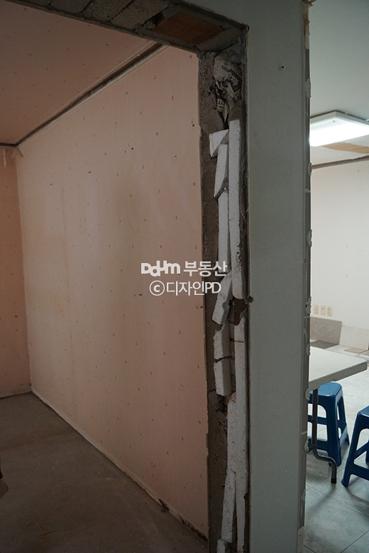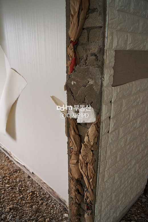 철거 후 현장의 모습은 제대로 된 시공과 마감이 이루어지지 않아 창호 주위에는 틈새가 가득하고, 도배 마감 뒷면의 벽 상태는 금이 가있으며, 문틀 공간에는 신문지와 스티로폼으로 군데군데 막아둔 것을 확인할 수 있었습니다.
