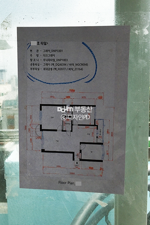 사전에 도면 위로 위치를 표시하고 준비한 타일과 규격이 일치하는지 미리 계산해야 깔끔하고 보기 좋은 타일 시공을 할 수 있습니다.