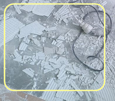 처음에는 약간 들뜬 느낌이 들었는데 점점 흔들리는 부위가 넓어져 결국에 들썩거리는 들뜸 타일 현상이 일어났습니다.