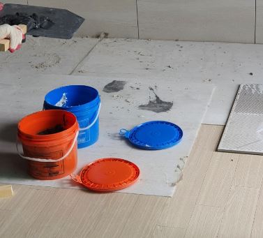 바로 작업에 들어갑니다. 실리콘과 에폭시를 사용해서 콘크리트에도 문제없게 단단히 붙을수 있게 시공을 하였고 가정집이다보니 먼지가 발생할수 있어서 비닐을 사용해서 작업을 하였습니다.