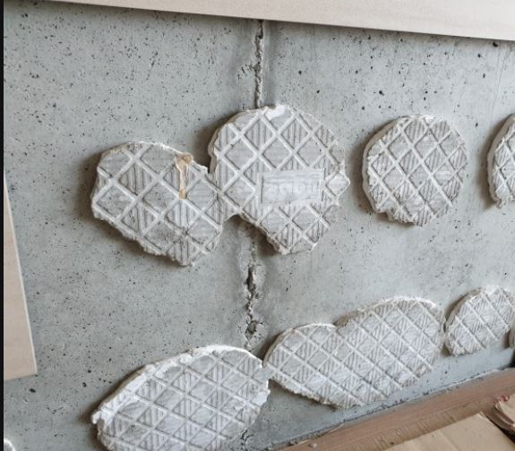 현장은 거실 아트월 타일들이 접착 불량으로 금이 가고 박리 현상이 일어나 떨어져내리고 들뜬 상태 입니다.