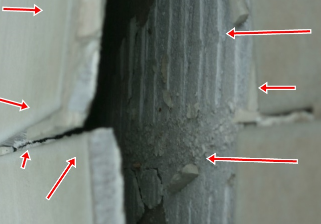 안쪽 벽면을 보면 안쪽 접착제와 타일간의 박리 현상이 뚜렷하게 나타나고 있습니다.