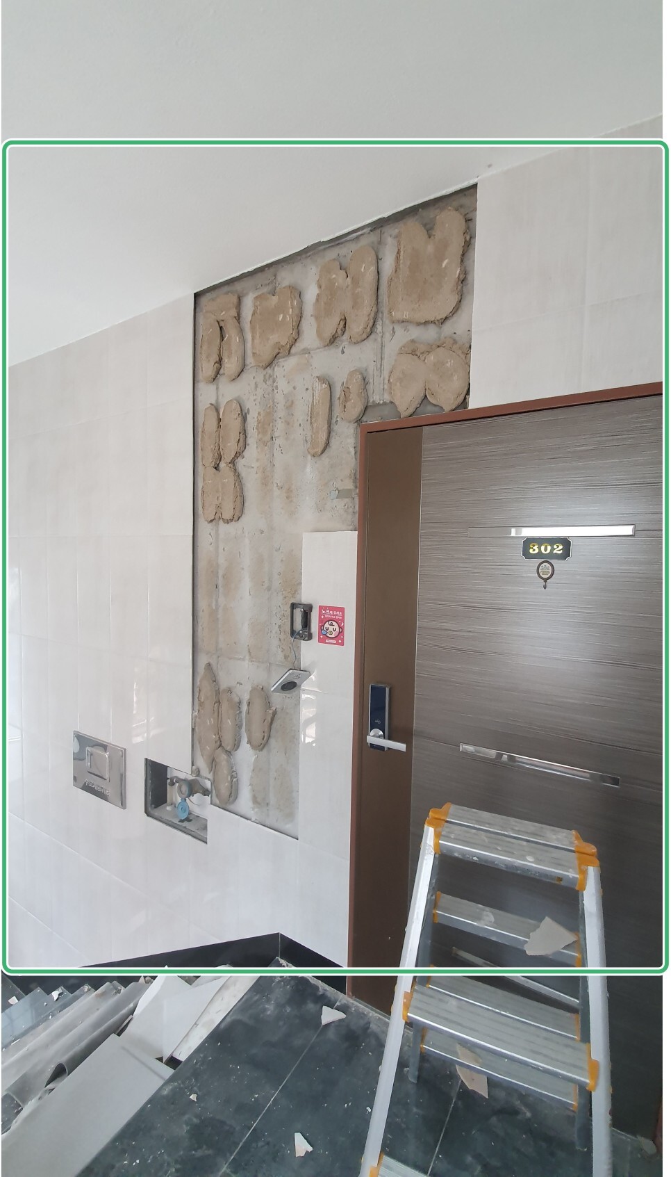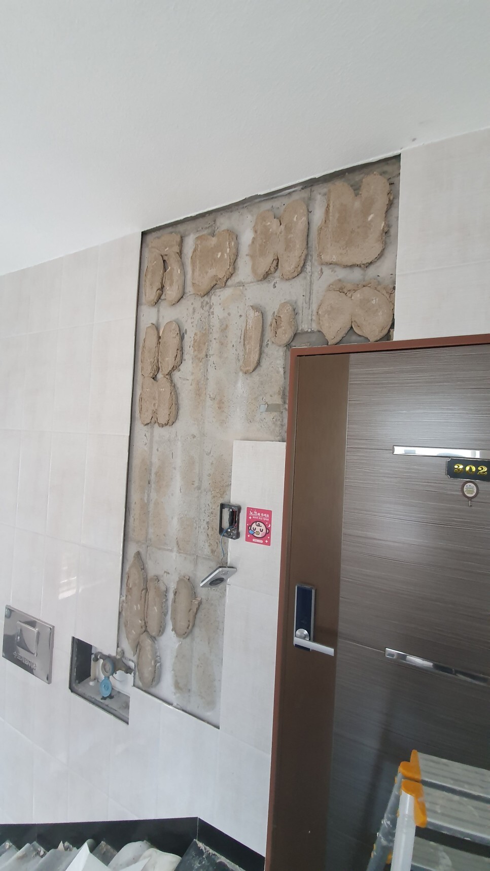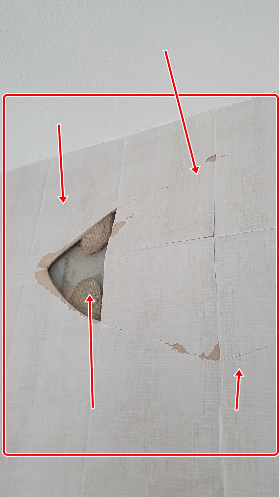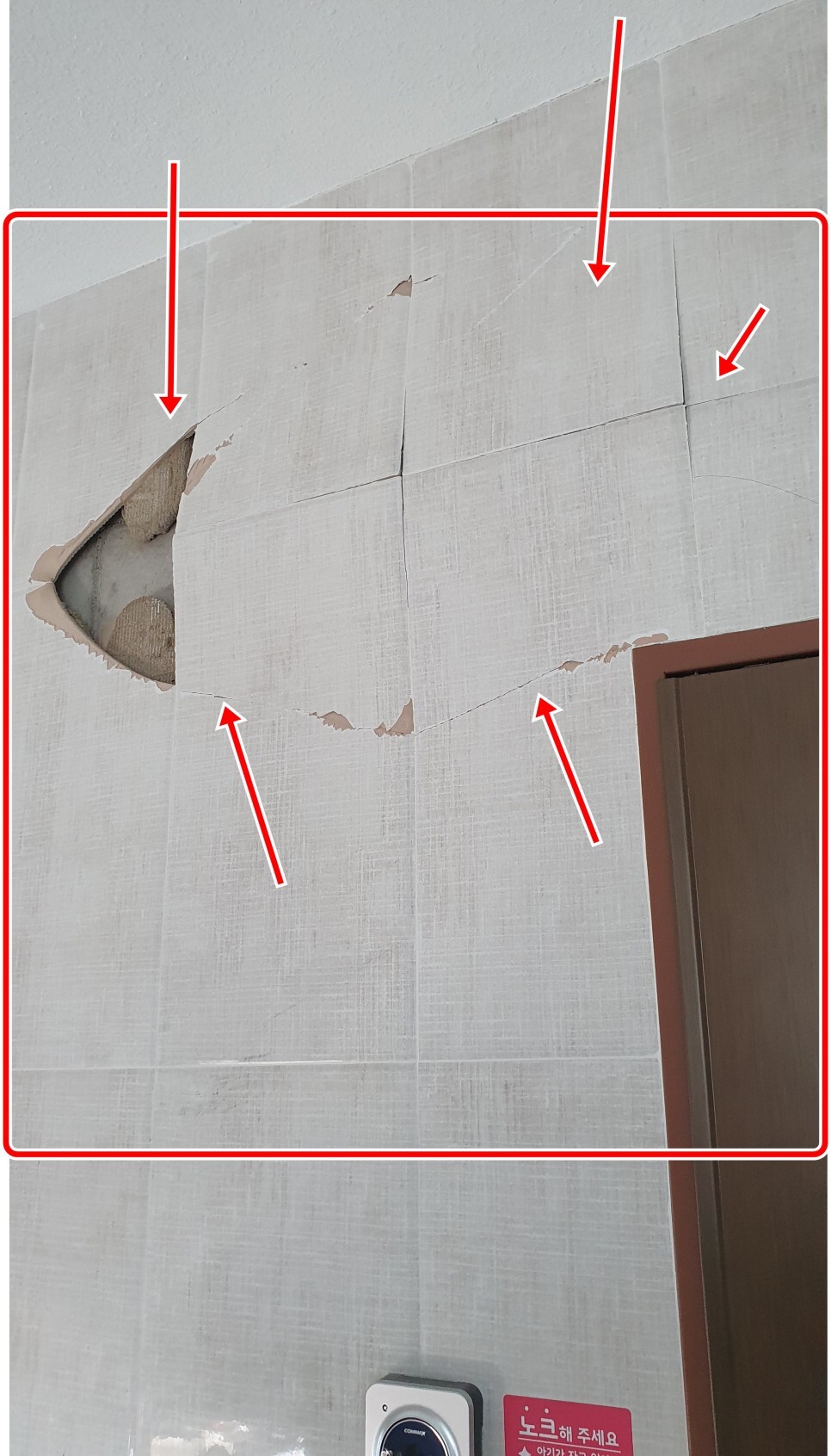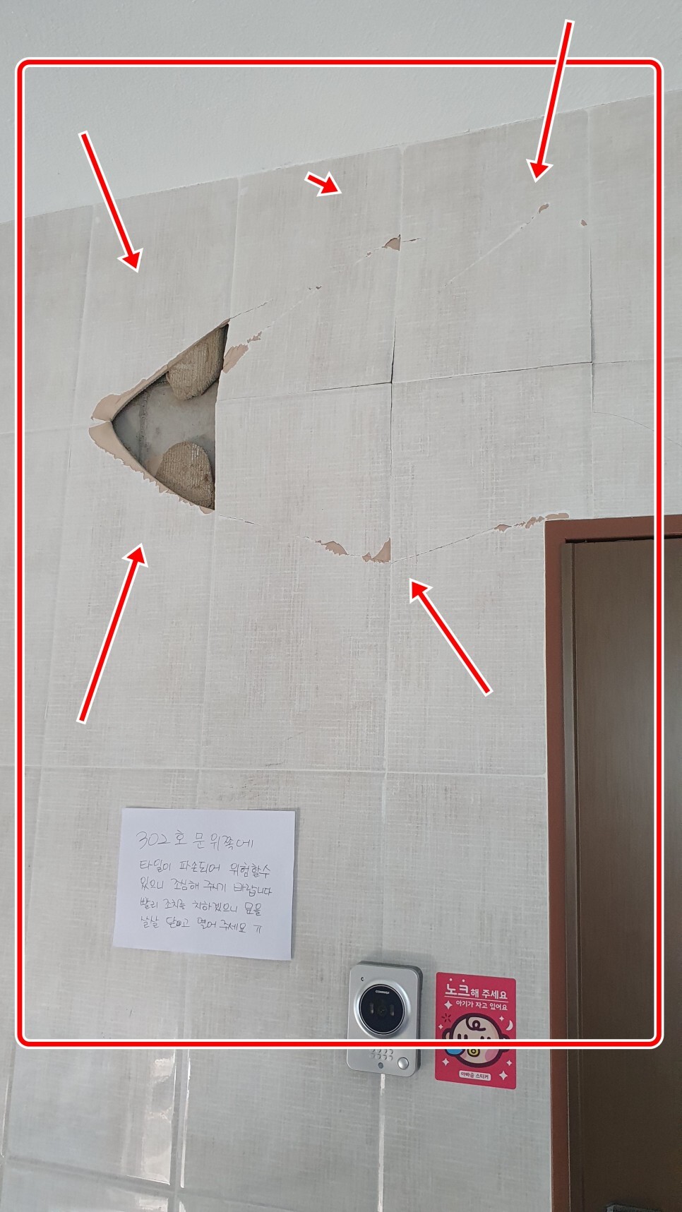 건물 복도 계단 특성상 습기와 온도차에 벽 타일에 처음엔 실금이 가다가 벽타들이 점점 배가부르고 팽창하다가 갑자기 앞으로 터지는 현상이 일어났습니다.