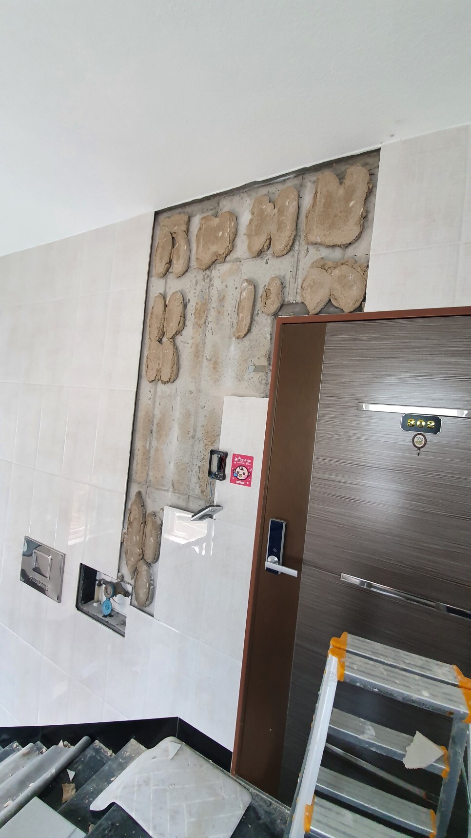 이번 현장은 김해시 관동동455-1 3층 계단 벽타일 들뜸 떨어짐 금 크랙 배부름현상 수리 하자보수 부분교체 현장 입니다.
