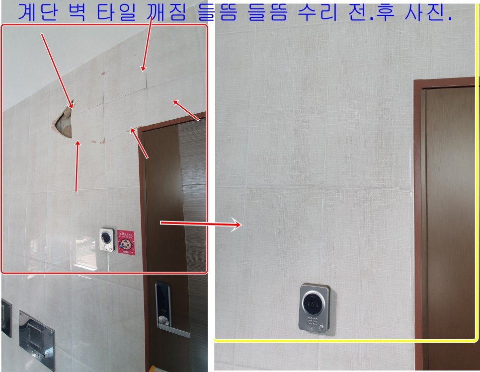 김해시 관동동455-1 3층 계단 벽타일 들뜸 떨어짐 금 크랙 배부름현상 수리 하자보수 부분교체 현장