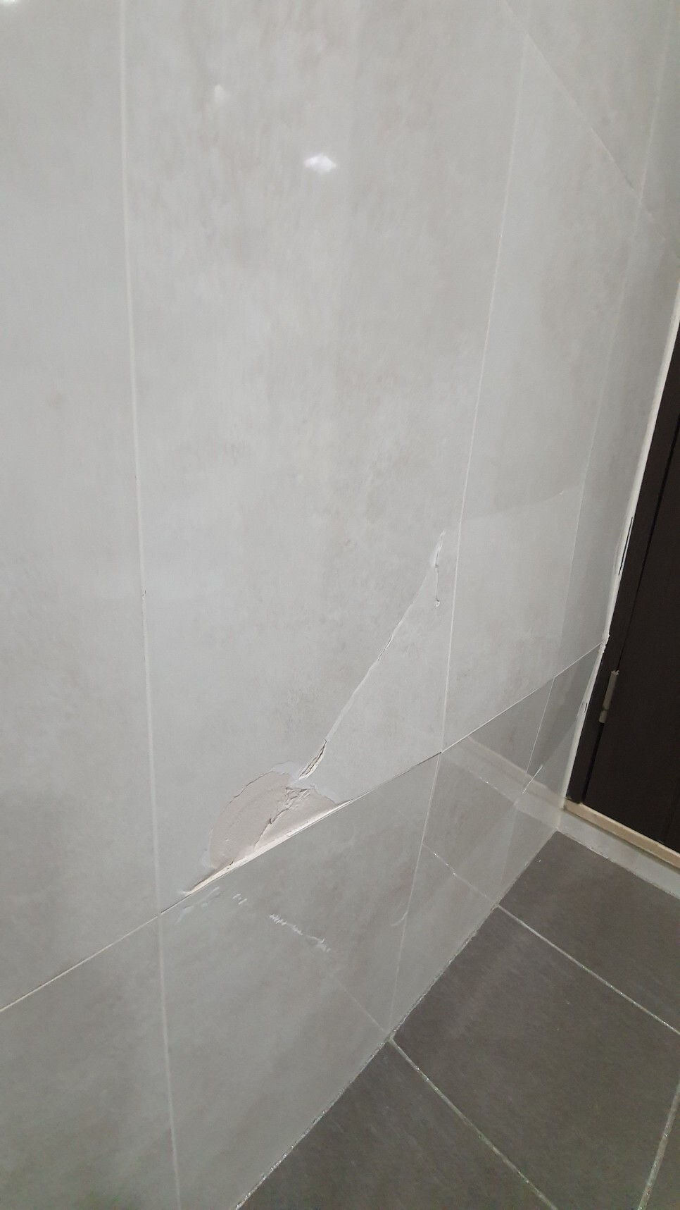 문 여닫는 벽 뒤쪽 벽타일이 아프로 솟고 들떠 문이 제대로 닫히지 않는 상황이었습니다.