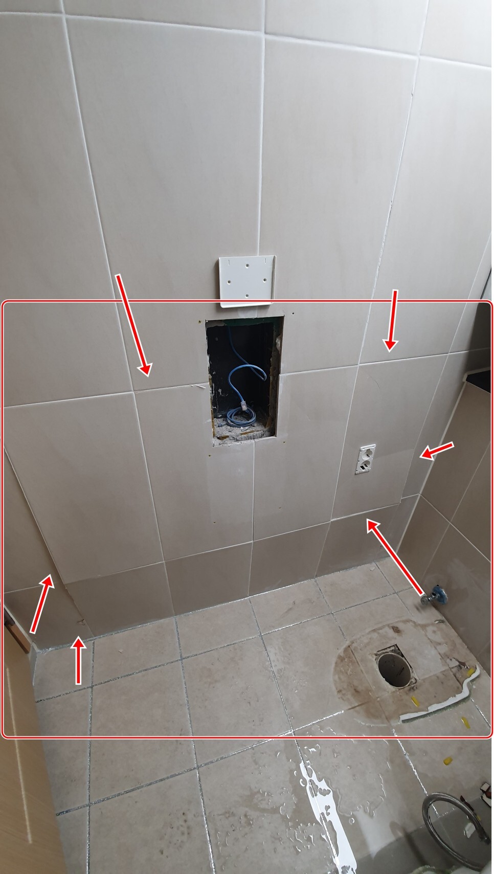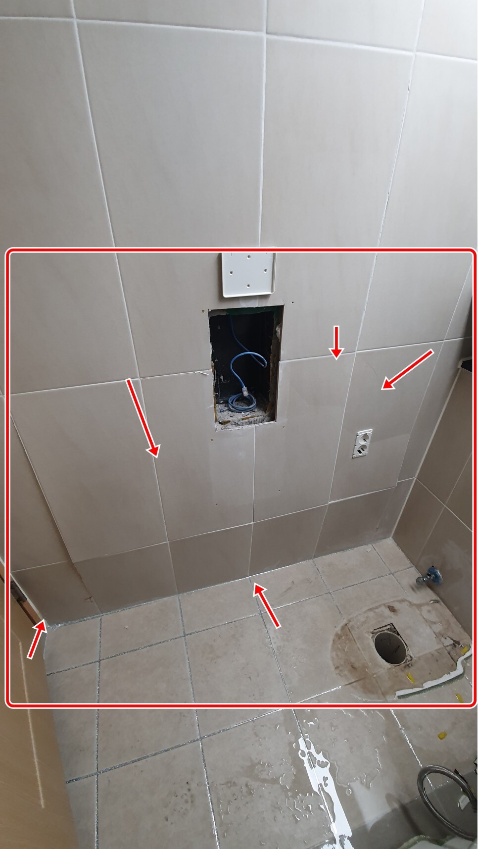 휴지걸이 콘센트등 부속물을 철거후 타일을 철거하고 안을 보니 벽타일 접착제인 몰탈과 타일간의 박리 현상으로 타일들이 앞으로 배가부르고 금이가고 들뜨는 현상이 발생해 하자가 발생했습니다.