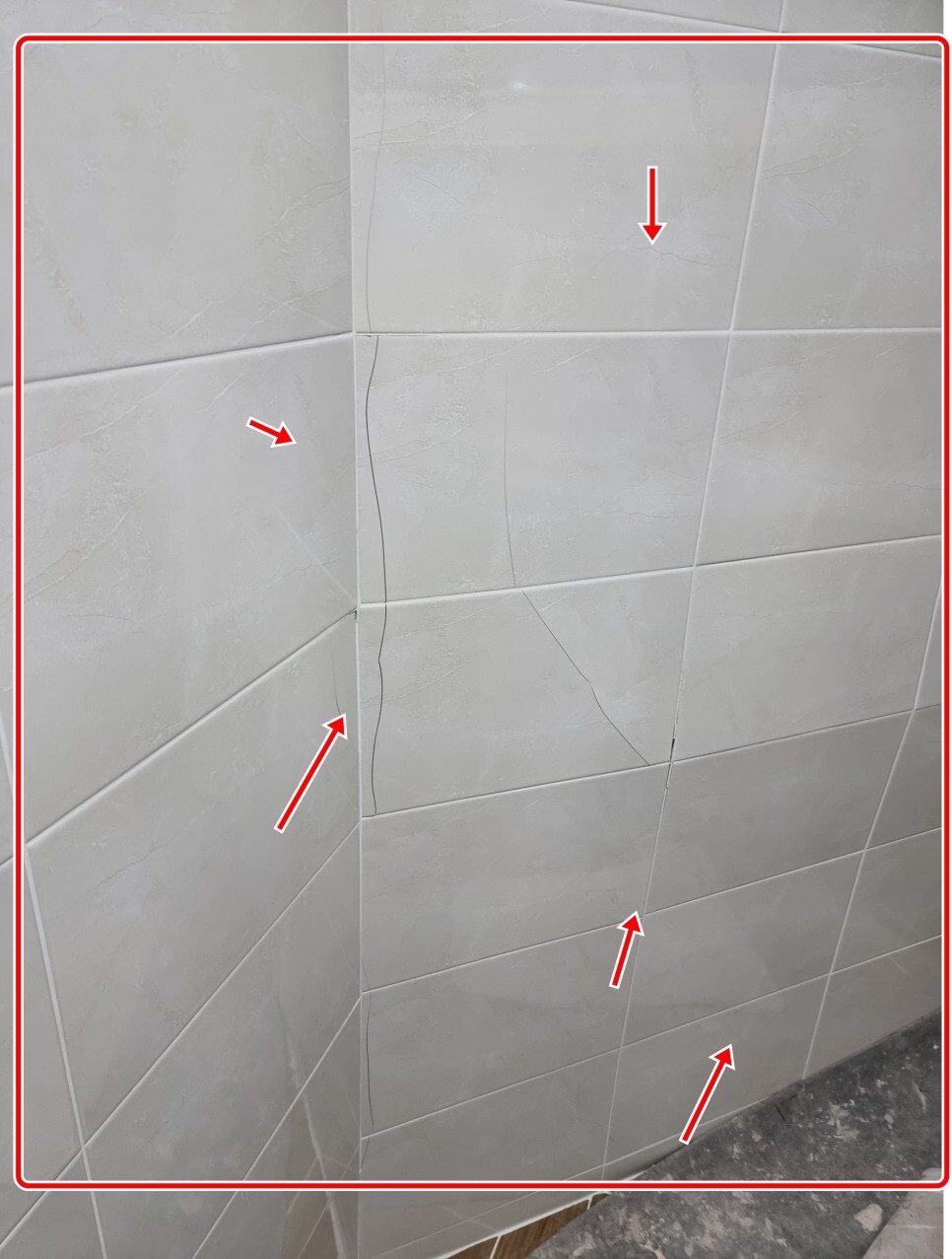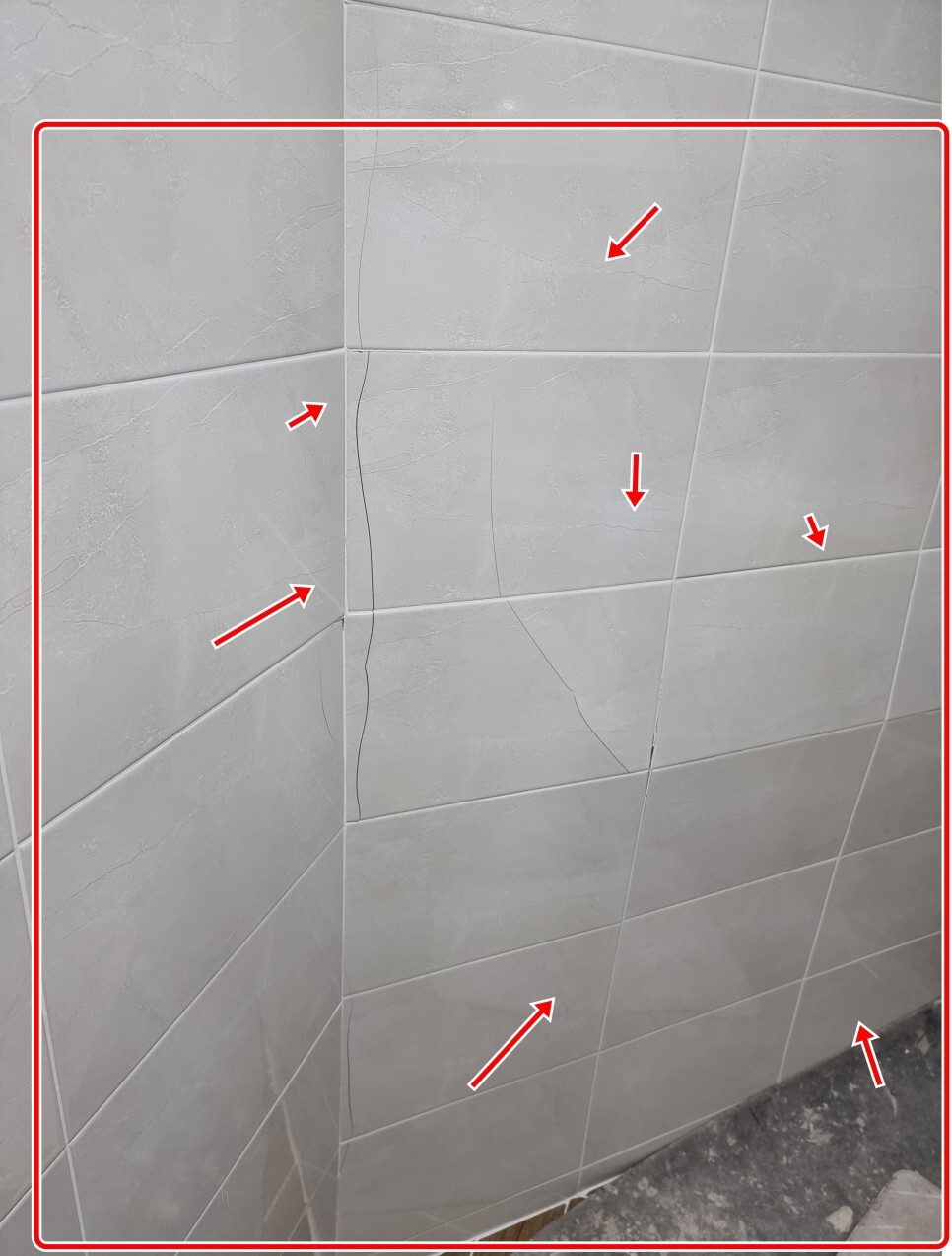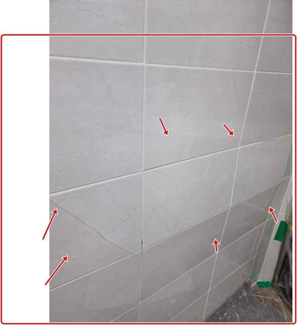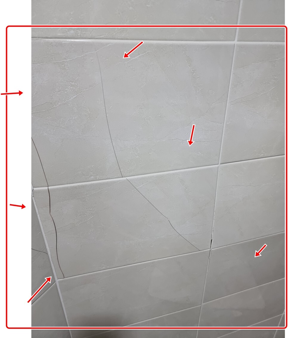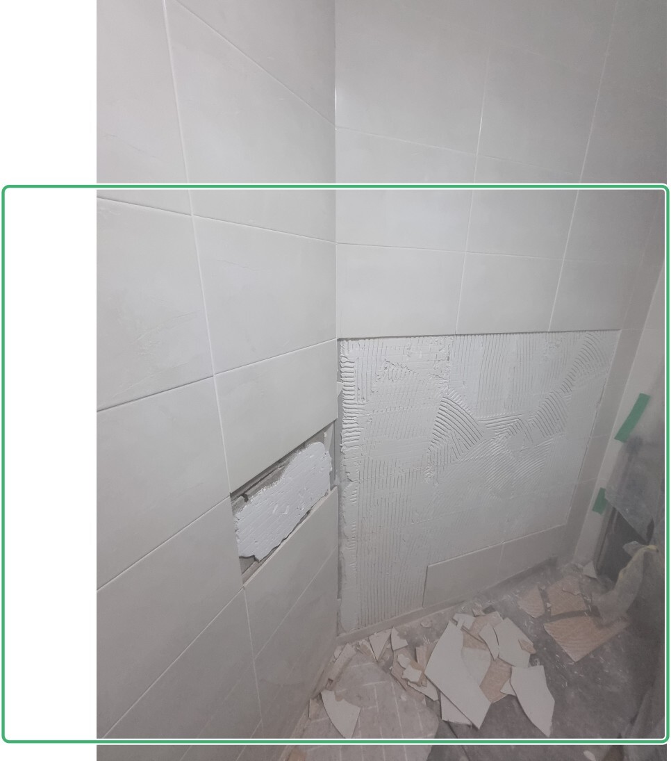 흔히 타일 리모델링후 덧방시공의 단점인 벽타일 안쪽 접착제인 타일본드와 타일간의 박리 현상으로 타일들이 앞으로 솟고 터지고 그이가 결국엔 들뜨는 현상이 발생해 하자가 발생했습니다.