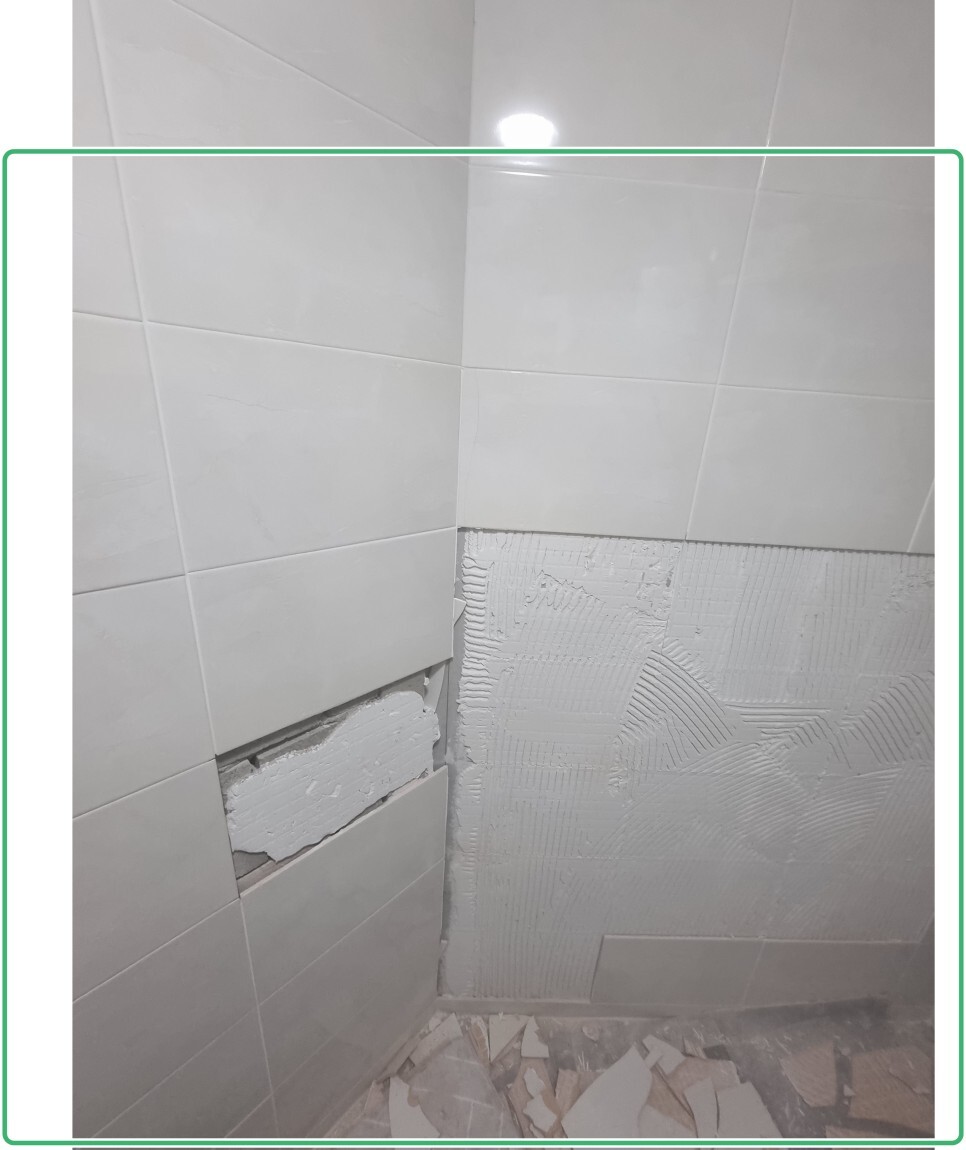 몇년전 벽타일 리모델링이후 잘못된 시공으로 벽타일에 충격이 가해지고 줄눈이 빠져 그사이로 수분이 들어거 안쪽의 본드가 풀어져 타일들이 흔들리고 들뜨고 깨지는 현상이 일어났습니다.