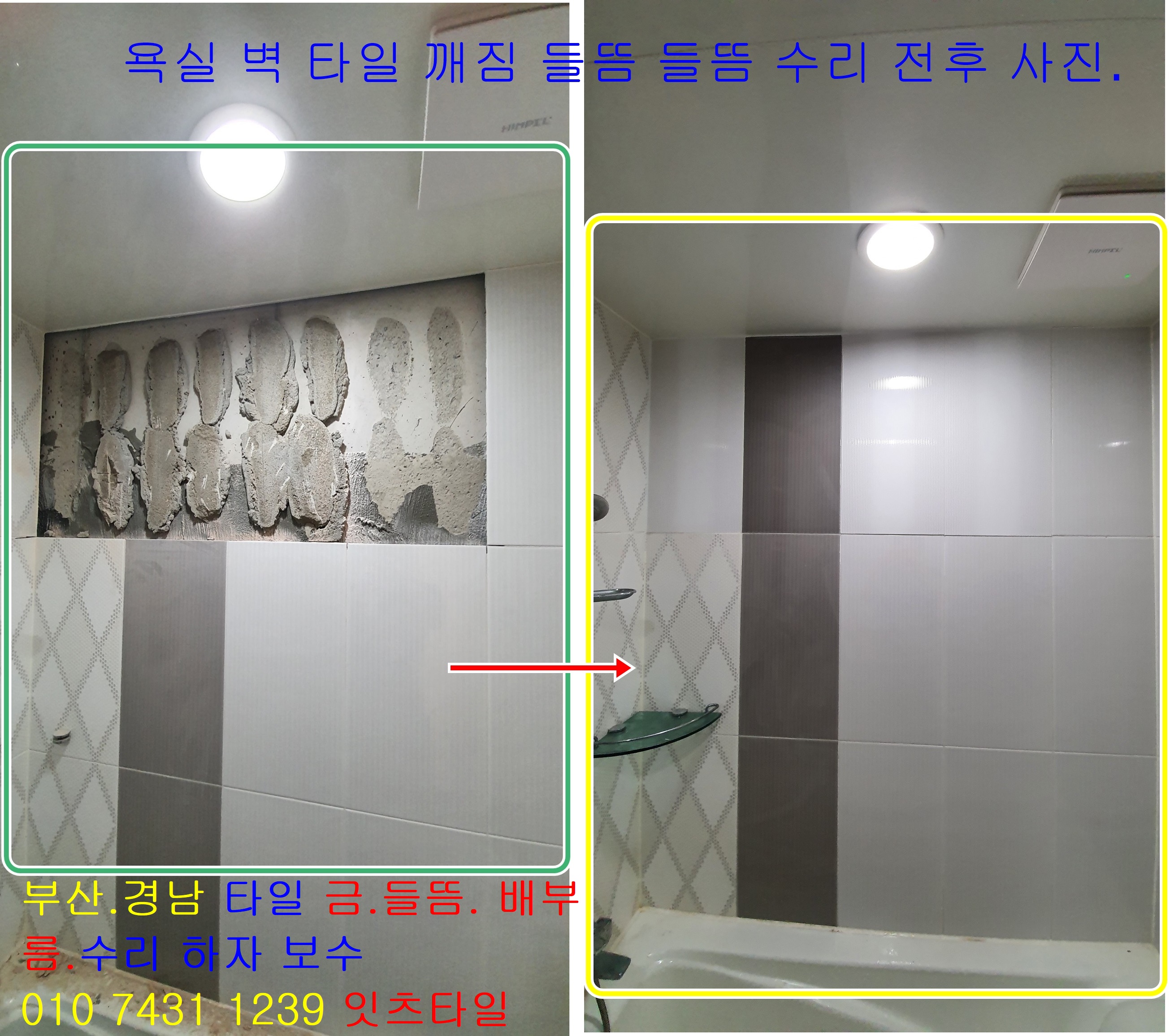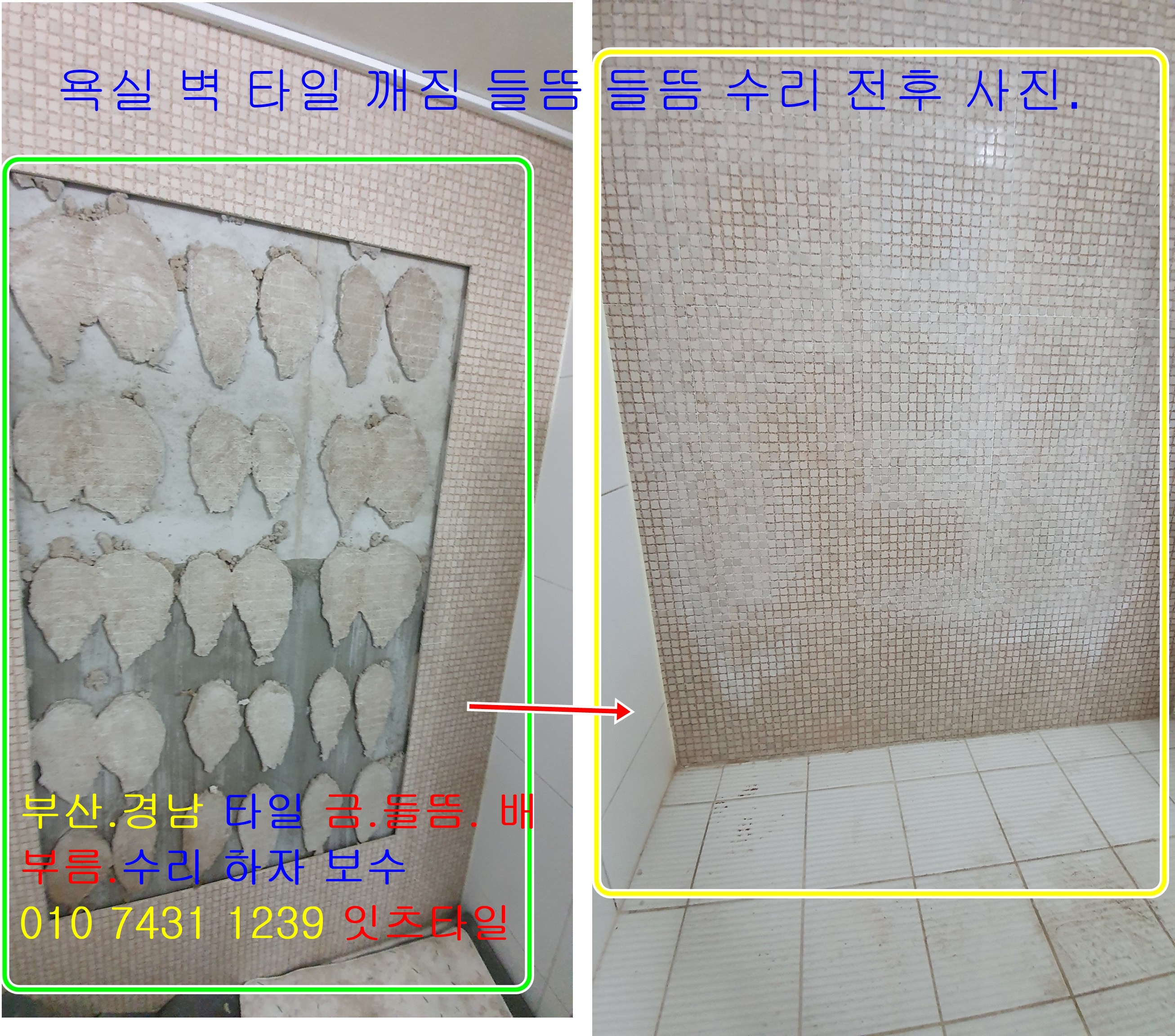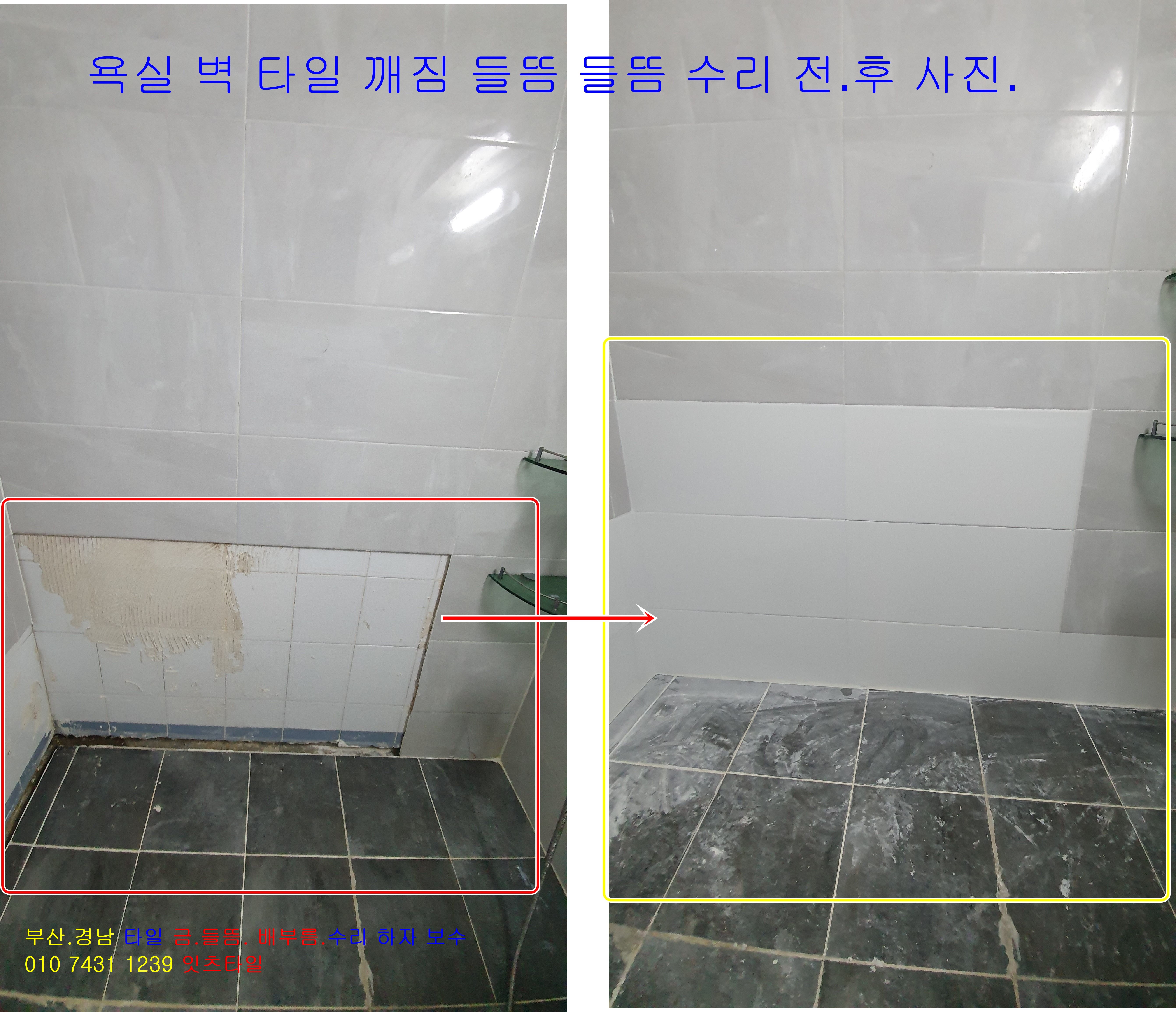 부산 타일 하자보수공사 타일수리공사 정관 명지 김해 양산 장유 물금 벽타일 바닥타일 들뜬 깨진 떨어진 구멍 팽창 깨짐 터짐 배부름 박리 크랙 갈라짐 부분 교체 공사