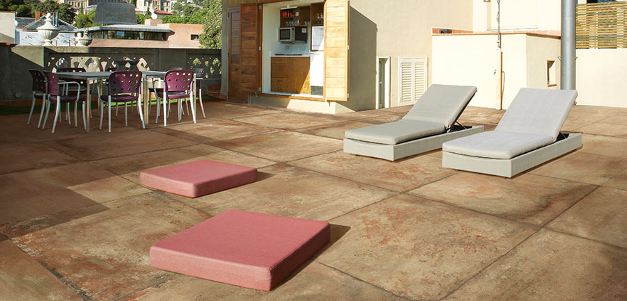 테라코타 타일 또는 슬래브(예: 톨로산 슬래브) 형태로 제공되는 테라코타 타일은 정통하고 따뜻한 특성으로 매력적입니다. 자연적으로 미끄럼 방지 기능이 있어 어두워진 후에도 낮의 열기를 유지하기 때문에 맨발로도 매우 쾌적합니다.