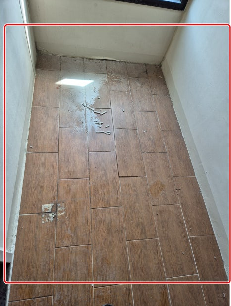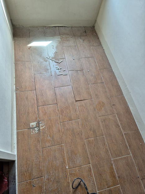 바닥 타일은 무거운 물건이 바닥 타일에 찍혀 구멍이 난 상태이고,위로 들뜬 상태 였습니다.