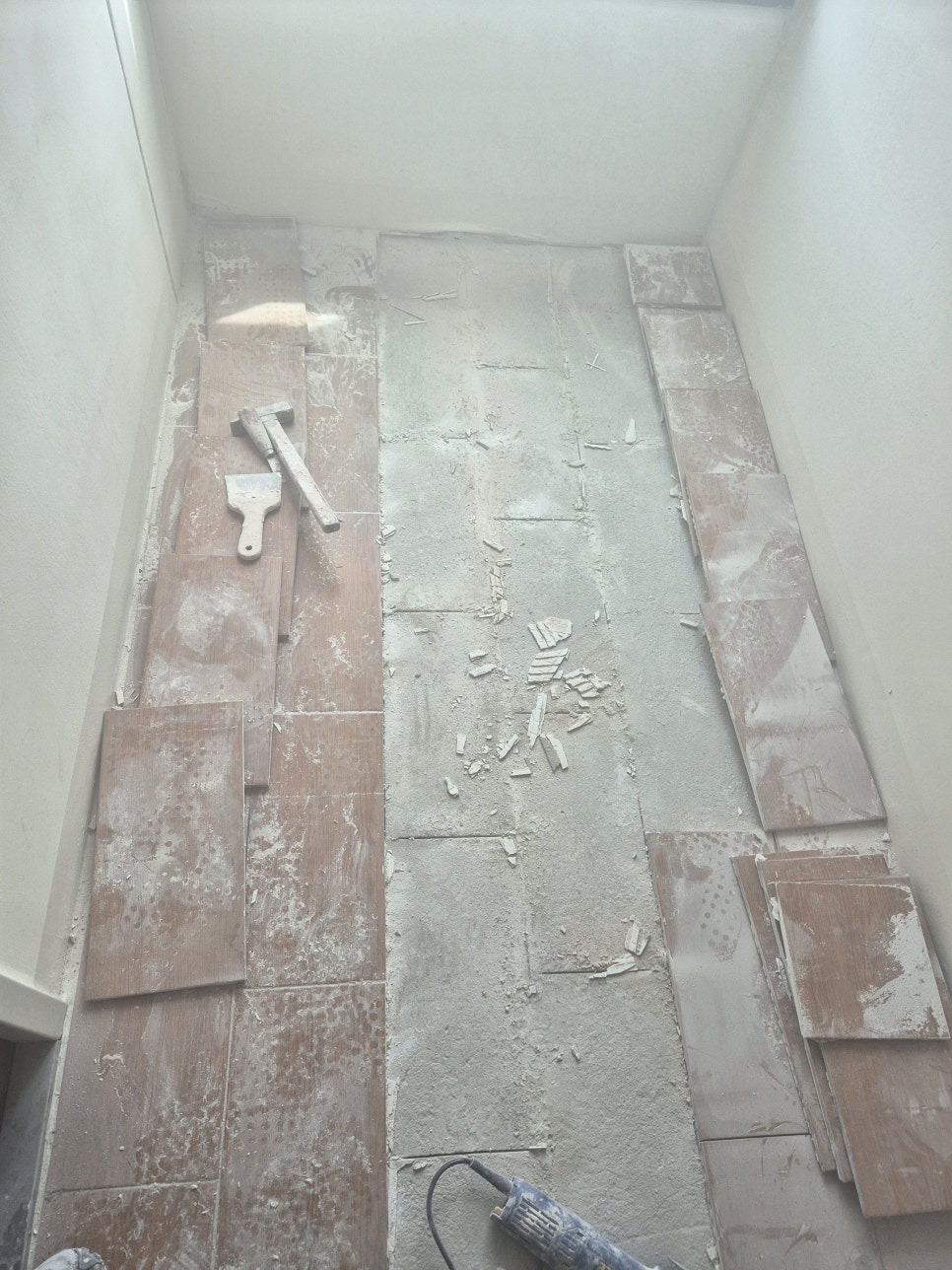 바닥타일 안쪽 접착제인 몰탈과 타일간의 박리 현상으로 타일들이 위로 솟고 들뜨는 현상이 발생해 하자가 발생했습니다.